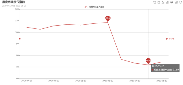 从绸都网发布的月度市场景气指数来看,该指数在今年1月达到顶峰(108.53),因国内疫情暴发而迅速下降,于5月10日达到最低点(71.89),随后略微上行。